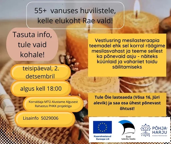 Kohtume mesinik Liia Vöörmann-Leissooga, kes räägib meile mesilasvahast ja kelle juhendamisel teeme ka põnevaid tooteid. Kuna jõulukuu on saabumas, siis tuleb kindlasti teha meevahast küünlaid ja neid teeme me kindlasti kohe mitut moodi. Tule kohale, saad ise teha ja küünla(d) ka koju kaasa viia.