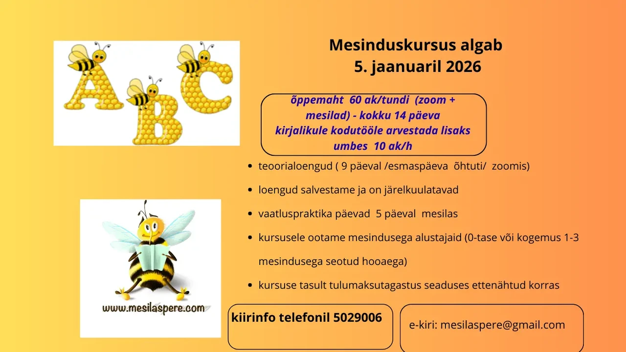 Kas tunned huvi looduse, mesilaste ja oma mee vastu? Mesinduse ABC kursus on mõeldud kõigile, kes soovivad alustada mesindusega või täiendada oma teadmisi mesindusest kui harrastusest.